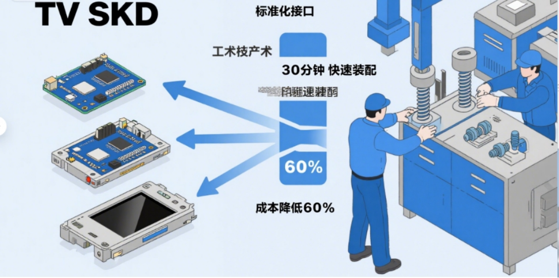 Đây là phương thức lắp ráp, trong đó các module TV cốt lõi (như bo mạch chủ, màn hình hiển thị và bo mạch nguồn) được lắp ráp thông qua các giao diện tiêu chuẩn. Ví dụ, dây chuyền sản xuất SKD của Guangzhou Jindi Electronics có thể được điều chỉnh cho TV LCD 40-65 inch của các thương hiệu phổ thông như Hisense và TCL, và việc nâng cấp có thể được hoàn tất bằng cách thay thế bo mạch chủ và điều chỉnh phần mềm. Các tính năng cốt lõi của phương thức này bao gồm: