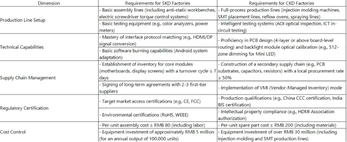 Tránh thuế quan: Hiệp định USMCA (Hiệp định Hoa Kỳ-Mexico-Canada) của Mexico yêu cầu thuế quan đối với các bộ phận thay thế của TV phải ≤ 5%, trong khi thuế quan đối với TV hoàn chỉnh lên tới 20%, khiến các doanh nghiệp Trung Quốc phải thành lập các nhà máy CKD tại Mexico.