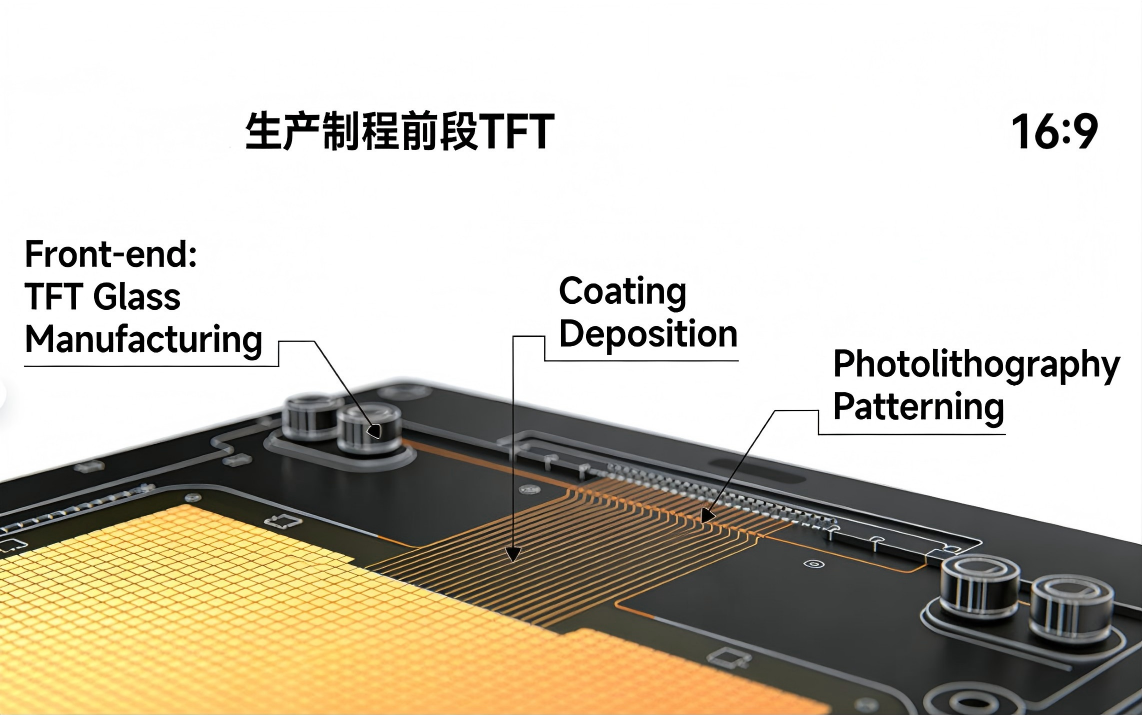 前端製程:專注於TFT玻璃的生產,類似半導體製造。它包括塗覆、光刻和其他工藝,用於製造金屬電路和半導體層。