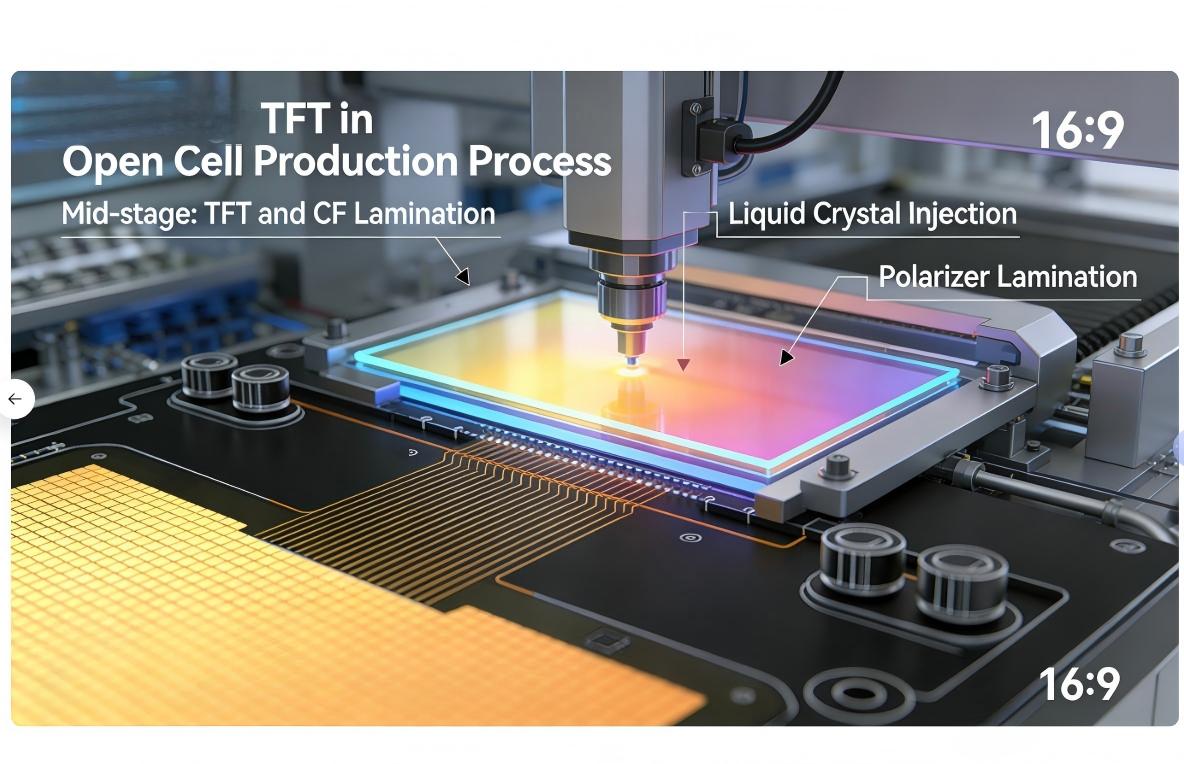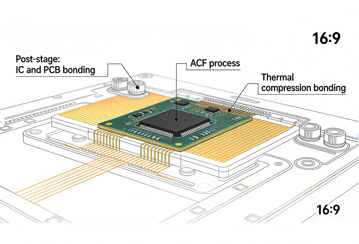後端製程:使用各向異性導電膜(ACF)將驅動IC和PCB黏合到LCD面板上,完成開放式液晶面板的最終形成。